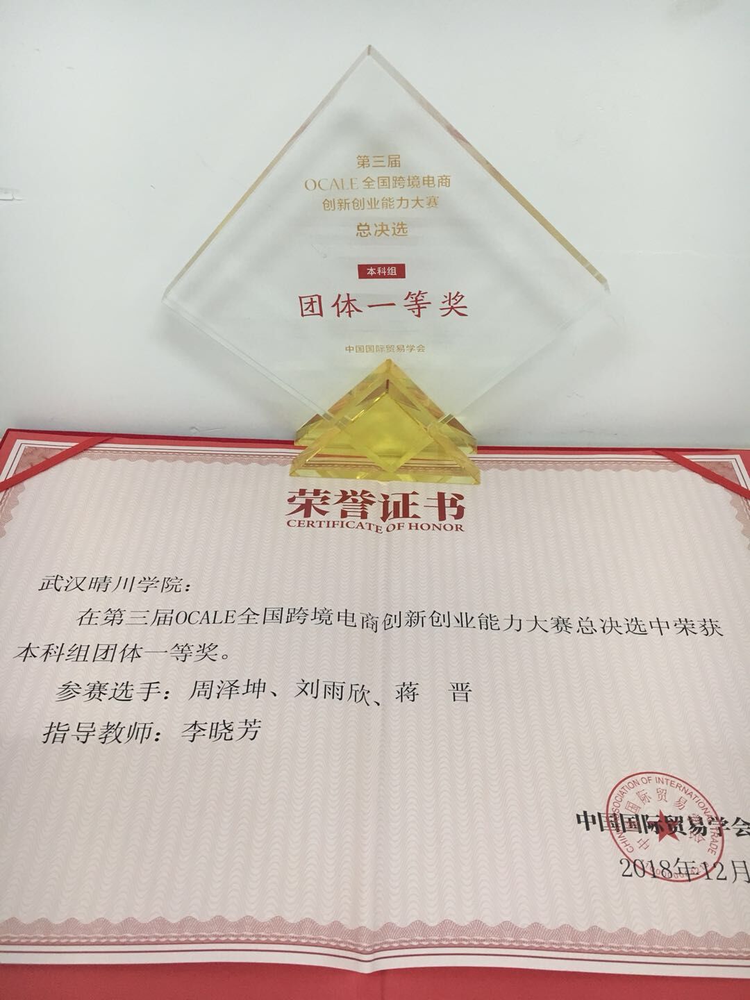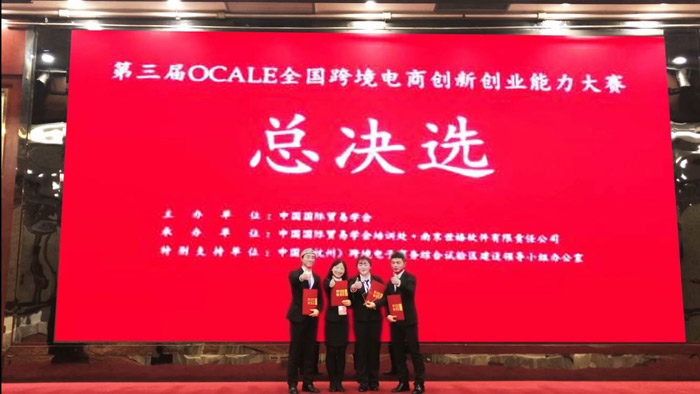 公司李晓芳老师、山秀娟老师指导的一个团队(蒋晋、周泽坤、刘雨欣)凭着在11月份的创新创业排名赛中取得了本科组一等奖的成绩,进入决赛,这次作为本科组一等奖的团队参加了在杭州举办的第三届OCALE全国跨境电商创新创业能力大赛总决赛,经过三天的努力,终于取得了全体一等奖的好成绩!