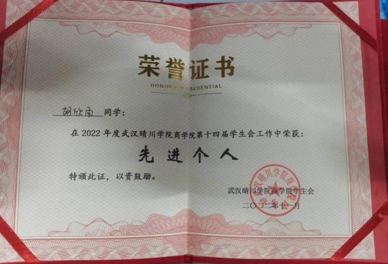 在校期间,胡欣雨同志始终以追求卓越为目标,秉持专业综合素质与学业成绩并重的理念,在学业道路上稳步前行,以优异成绩跻身专业前列,成为同学们的学习榜样。