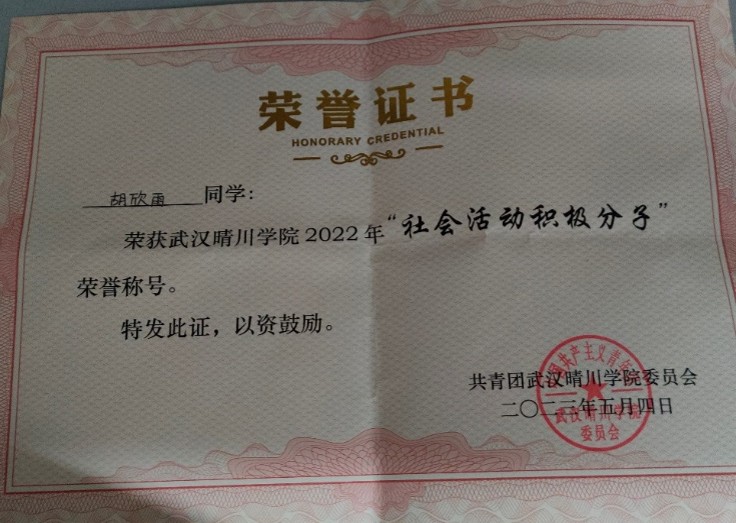 (注释:荣获“社会活动积极分子”荣誉称号)