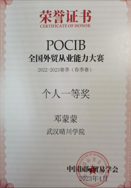 2023年4月,在POCIB全国外贸从业能力大赛2022-2023赛季(春季赛)获得个人一等奖