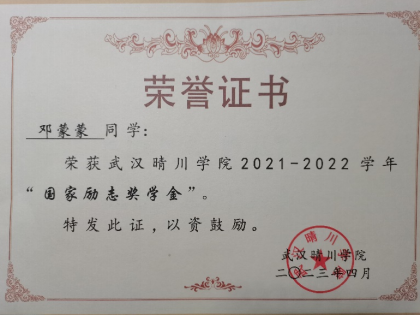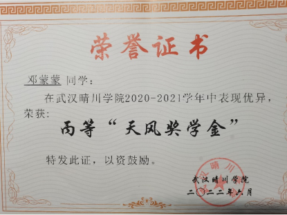 “学而不思则罔,思而不学则殆”,自入学以来,邓蒙蒙同志便严格要求自己,有计划地学习专业课程知识,注重课外知识和技能拓展,全面提高文化素质,且综测专业成绩始终名列前茅,并在2020-2021学年荣获丙等“天风奖学金”,