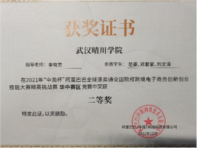 2021年12月,在2021年“中渤杯”阿里巴巴全球速卖通全国院校跨境电子商务创新创业技能大赛精英挑战赛华中赛区竞赛中获得二等奖