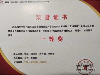 2023年4月,在第四届“育知联杯”全国老员工智慧商业大数据创新应用大赛总决赛(本科组)“商业大数据创新应用”赛道中获得一等奖