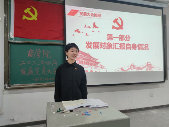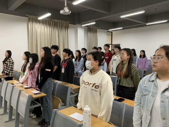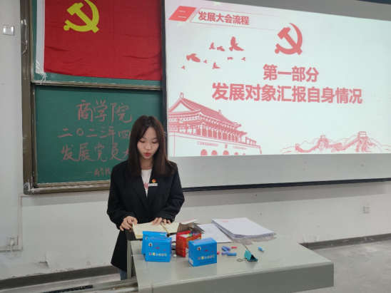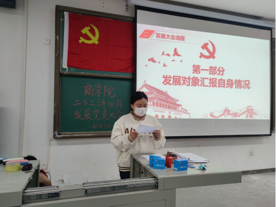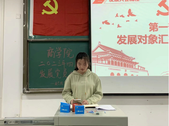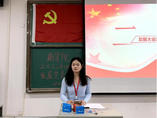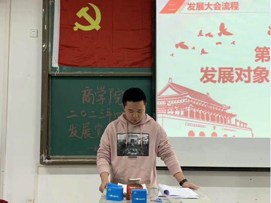 大会开始。全体成员起立奏唱国歌,本次大会正式拉开序幕。此次发展党员大会共分为五个部分:发展对象汇报自身情况、入党介绍人介绍发展对象基本情况,发表意见、支部书记介绍支部审议和个人政审情况、参会党员发表意见、投票表决。