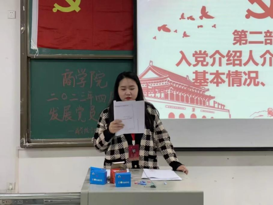 会议第一项,由钟小泉等八位同志分别从学习,工作,生活等方面向全体党员汇报自己在入党积极分子期间的表现。