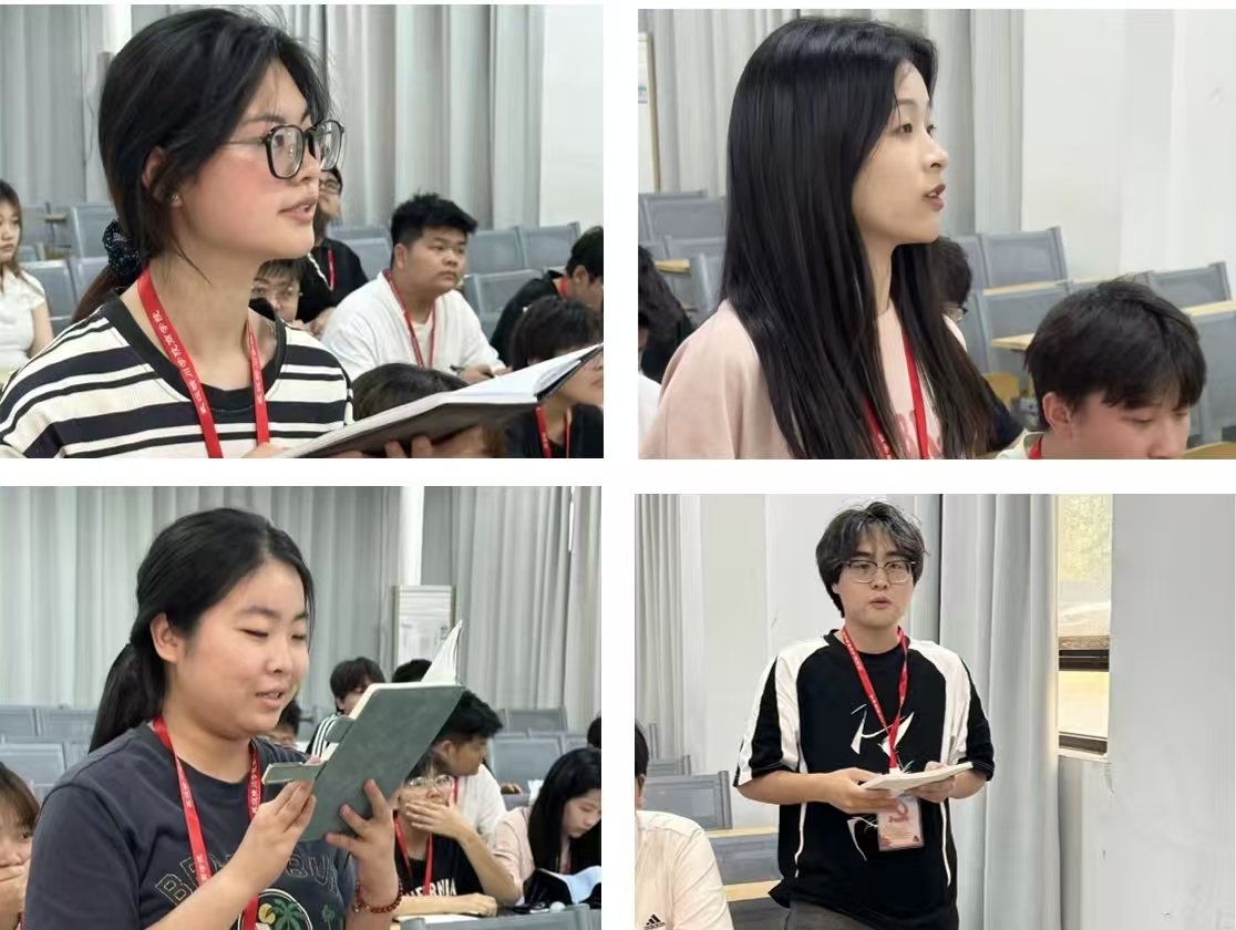 随后是学习感悟分享环节。唐紫萱、黄青勇两位同学积极发言,他们从不同角度深入探讨了“如何将回信精神落实到日常学习和生活中”,并提出具体举措,如参与暑期社会实践、赴贫困地区开展调研等。