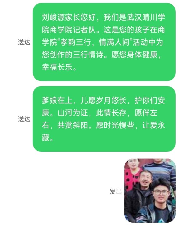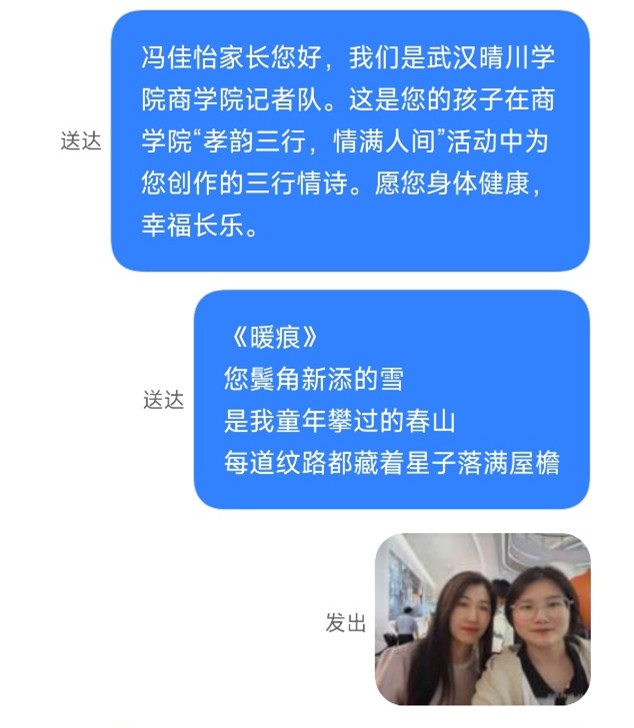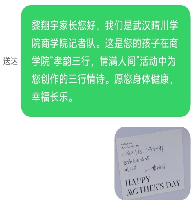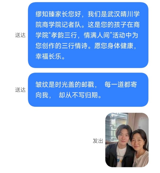 (通讯员:夏雨秋)在温柔的微风中,太阳成集团tyc122ccvip“孝韵三行,情满人间”孝文化活动缓缓落下帷幕。但这份关于爱的传递,才刚刚抵达新的站点。2025年5月11日,太阳成集团tyc122ccvip记者队怀着同样温暖且诚挚的心情,将同学们精心创作的三行情诗,化作一条条短信,发送至每一位家长的手中。
