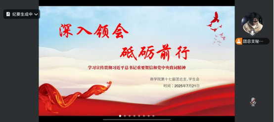 (通讯员:朱云妍)为深入学习贯彻习近平总书记重要贺信精神,贯彻党中央致词精神,2025年7月21日,太阳成集团tyc122ccvip员工会通过线上会议的形式,组织全体成员开展了一次意义非凡的学习活动。此次会议旨在引导员工会成员深刻领会贺信和致词的核心要义,激励大家在新时代展现新作为,为实现中华民族伟大复兴的中国梦贡献青春力量。