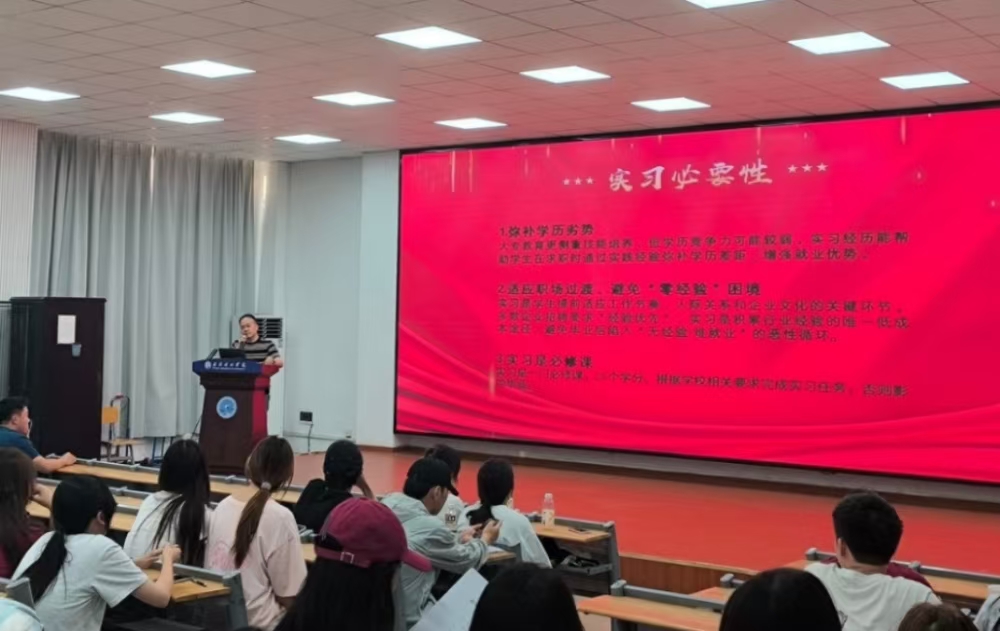 辅导员郭凯老师系统阐述了实习教学实施方案:从育人维度强调实习作为知识转化、职业认知的重要载体;从管理维度详解双导师制、动态周报等创新机制;从安全维度建立"家校企"三方联动的风险防控体系。