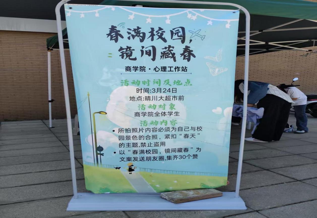 (通讯员:黄丽福)春天,是生命复苏的季节,也是滋养心灵的契机,当暖风吹绿了校园的草坪,当枝头绽放出第一朵樱花,春天的脚步,已然悄悄踏入了校园。但随着气候多变的春天到来,人们的心理疾病发生率也随之增加。为此,在3月25日,晴川大超市前,心理工作站展开了“春满校园,镜间藏春”的心理活动。本次活动,将引导同学们停下忙碌的脚步,发现校园环境的变化,并与同学们共同感受春天的到来,校园的美丽,万物的复苏。